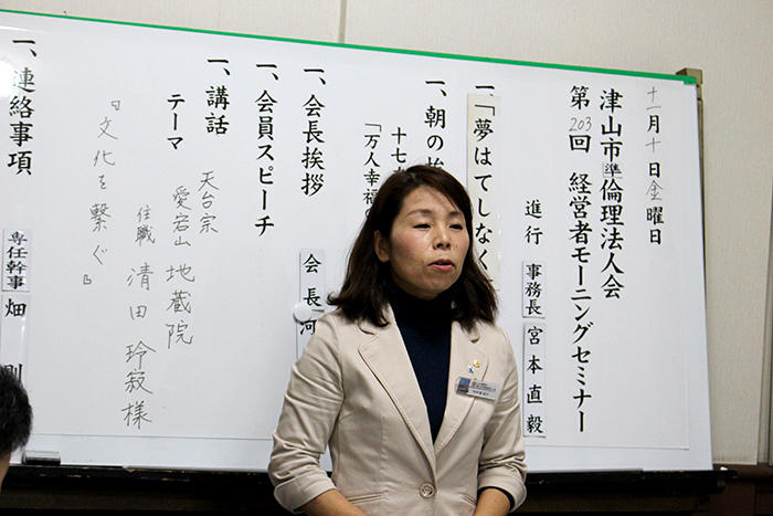 講話者でもそうですが、津山を中心とした県北の一体化を目指しています。地元に愛着の強い経営者様も多く、倫理を学び、この津山の文化、土地を学んでいます。モーニングセミナーを通じ、津山の街に誇りを持ってもらいたい。津山の知られざるエネルギーをいっぱい学べます。