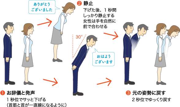 | お辞儀 | 基本は4動作(1で下げ、2で静止し、3、4とゆっくり戻す) |