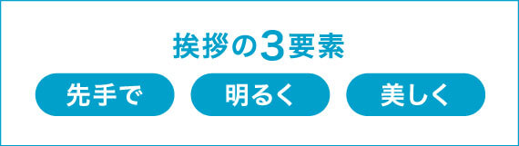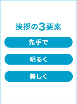 打てば響く「ハイ」のひとこと。間髪をいれない「ハイ」という元気な返事は自分自身はもちろん、まわりの人の気持ちも明るくします。日常の業務でも打てば響くような返事ができるよう、毎日の朝礼で訓練しましょう。
